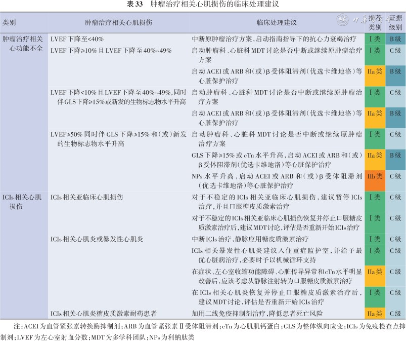 2. ICIs相关心肌损伤和心肌炎。ICIs相关亚临床心肌损伤可表现为只有cTn水平升高,心电图、超声心动图或CMR检查均未见明显异常,也没有明确的心脏相关的临床症状。ICIs相关心肌炎有心肌炎的临床表现,新发的cTn水平升高或显著升高,心电图和(或)超声心动图检查异常,同时CMR检查和(或)EMB检查结果显示活动性心肌炎表现,且除外ACS和急性感染性心肌炎。暴发性心肌炎除上述表现外,伴血液动力学不稳定、需要无创或有创机械通气治疗的心衰,伴或不伴完全性或高度房室传导阻滞和(或)严重的室性心律失常。(1)评估和监测:①心脏生物标志物:约90%的ICIs相关心肌炎患者出现cTn水平升高[479]。cTn也可用于预后评价[480]。推荐对于临床怀疑ICIs相关心肌炎的患者,检测cTn/hs-cTn水平用于ICIs相关心肌炎的诊断和鉴别诊断(Ⅰ类推荐,A级证据)。应该考虑动态监测cTn/hs-cTn 水平用于指导ICIs相关心肌炎的治疗(IIa类推荐,B级证据)。②影像学评价:对于临床可疑的ICIs相关心肌炎患者应进行超声心动图和CMR检查协助诊断,CMR检查采用改良的Lake Louise标准。推荐心电图和心血管影像学(超声心动图和CMR检查)诊断ICIs相关心肌炎(Ⅰ类推荐,B级证据)。③EMB:如果疑诊ICIs相关心肌炎,但在心脏影像学和生物标志物检查后未得到证实,则应考虑在有经验的医学中心进行EMB来确诊(IIa类推荐,C级证据)。(2)治疗:对于稳定的ICIs相关亚临床心肌损伤,因糖皮质激素治疗获益与风险不明确,推荐继续进行监测。对于不稳定的ICIs相关亚临床心肌损伤,建议暂停ICIs治疗(Ⅰ类推荐,C级证据),并且口服糖皮质激素治疗,逐渐减量,直至cTn水平恢复至基线水平后停用[481]。对于临床可疑的ICIs相关心肌炎患者建议暂停ICIs治疗(Ⅰ类推荐,C级证据)。对于暴发性心肌炎和非暴发性心肌炎(有症状但稳定),在最初3~5 d内,一旦认为可能,应尽快开始静脉糖皮质激素治疗以降低心血管事件风险(Ⅰ类推荐,C级证据)[481]。如果在最初 24~72 h内出现临床改善,则可以改用口服糖皮质激素(IIa类推荐,C级证据)。难治性患者及糖皮质激素耐药患者,应该考虑加用二线免疫抑制剂治疗,降低患者的死亡风险(IIa类推荐,C级证据)。ICIs相关心肌炎合并心功能异常的治疗参考CTRCD的管理。在ICIs相关心肌损伤或心肌炎恢复并停止口服糖皮质激素治疗后,建议MDT讨论,以评估是否重新开始ICIs治疗(Ⅰ类推荐,C级证据)。