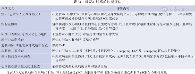 初始评估包括病史、实验室检测、标准12导联心电图及24h~48h动态心电图及心脏影像学检查等,在心脏影像学检查中,超声心动图检查是首选,有助于心肌病的诊断、监测及预后评估;CMR检查是重要补充,可以进一步明确心肌病的诊断及预后评估;基因检测有助于心肌病的分型及家系筛查;对于部分不能明确诊断的心肌病患者,在有条件的医学中心,应该考虑EMB(表34,图13)。心肌肥厚性疾病的鉴别见表35。