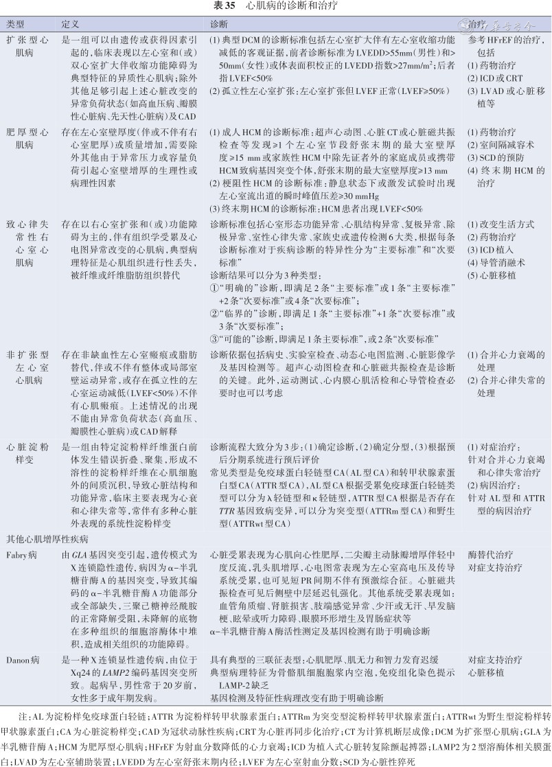注:AL为淀粉样免疫球蛋白轻链;ATTR为淀粉样转甲状腺素蛋白;ATTRm为突变型淀粉样转甲状腺素蛋白;ATTRwt为野生型淀粉样转甲状腺素蛋白;CA为心脏淀粉样变;CAD为冠状动脉性疾病;CRT为心脏再同步化治疗;CT为计算机断层成像;DCM为扩张型心肌病;GLA为半乳糖苷酶A;HCM为肥厚型心肌病;HFrEF为射血分数降低的心力衰竭;ICD为植入式心脏转复除颤起搏器;LAMP2为2型溶酶体相关膜蛋白;LVAD为左心室辅助装置;LVEDD为左心室舒张末期内径;LVEF为左心室射血分数;SCD为心脏性猝死