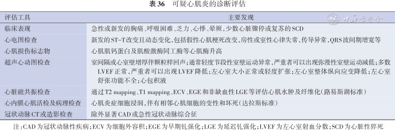 2. 心肌炎的诊断(表37):(1)“可能的”心肌炎:需同时满足:①心肌炎的临床表现,②心肌损伤标志物升高,③除外显著CAD或ACS;(2)“很可能的”心肌炎:需同时满足:①心肌炎的临床表现,②心肌损伤标志物升高,③心电图或超声心动图检查符合心肌炎改变;④除外显著CAD或ACS;(3)“确诊的”心肌炎:需同时满足:①心肌炎的临床表现,②心肌损伤标志物升高,③心电图或超声心动图检查符合心肌炎改变,④CMR或EMB检查符合心肌炎改变,⑤除外显著CAD或ACS。