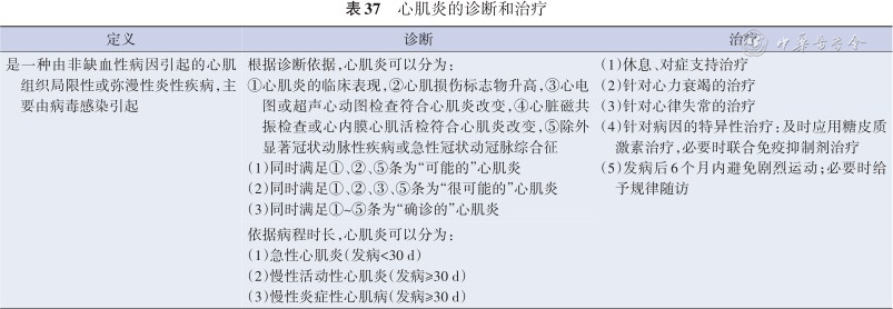 | 是一种由非缺血性病因引起的心肌组织局限性或弥漫性炎性疾病,主要由病毒感染引起 | 根据诊断依据,心肌炎可以分为: ①心肌炎的临床表现,②心肌损伤标志物升高,③心电图或超声心动图检查符合心肌炎改变,④心脏磁共振检查或心内膜心肌活检符合心肌炎改变,⑤除外显著冠状动脉性疾病或急性冠状动冠脉综合征 (1)同时满足①、②、⑤条为“可能的”心肌炎 (2)同时满足①、②、③、⑤条为“很可能的”心肌炎 (3)同时满足①~⑤条为“确诊的”心肌炎 | (1)休息、对症支持治疗 (2)针对心力衰竭的治疗 (3)针对心律失常的治疗 (4)针对病因的特异性治疗:及时应用糖皮质激素治疗,必要时联合免疫抑制剂治疗 (5)发病后6个月内避免剧烈运动;必要时给予规律随访 |
