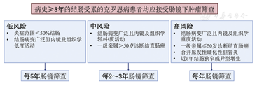 推荐意见42:推荐病程超过8年的结肠受累的CD患者接受肠镜检查以筛查肠道癌变,结肠镜筛查的频率取决于癌变风险分级。对于CD相关小肠癌及肛周癌变,目前尚无证据支持常规筛查。(证据等级:3,推荐强度:强)