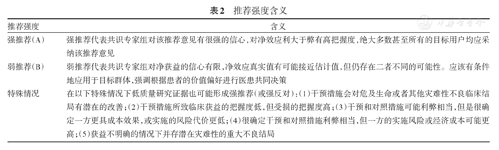 | 强推荐(A) | 强推荐代表共识专家组对该推荐意见有很强的信心,对净效应利大于弊有高把握度,绝大多数甚至所有的目标用户均应采纳该推荐意见 |