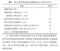 CD疾病活动度主要分为临床疾病活动度及内镜下疾病活动度,目前没有用于评价疾病活动度的金标准。常用的临床疾病活动度评分主要指CDAI,以及在此基础上衍生出简单易操作的评分,主要包括简化CDAI评分(表4)及Best CDAI(表5)。常用的内镜疾病活动度评价方法包括CDEIS、SES-CD(表6)。