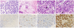 5例患儿均行双侧睾丸下降固定术和腹腔镜探查,均发现MRs(其中例4盆腔超声未发现MRs)(表3)。例1~4性腺病理诊断均为发育不良的睾丸,表现为光镜下可见睾丸间质疏松、纤维增生、水肿,曲细精管变形,生殖细胞成熟延迟(图1)。其中,例2患儿13月龄时睾丸苏木素-伊红染色为睾丸肿瘤细胞融合成细胞巢,免疫组织化学结果为:Oct3/4,个别曲细精管中心部(+),个别曲细精管基底部(+);CD117,个别曲细精管细胞(+);PLAP,散在曲细精管内个别细胞(+);TSPY1,部分曲细精管基底部(+)。病理诊断为双侧睾丸生殖细胞成熟延迟及灶状前原位生殖细胞瘤(图1)。