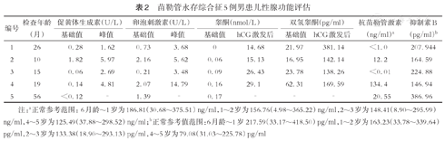 | 2 | 10 | 右侧阴囊空虚,左侧腹股沟疝 | 双侧乳房B1期,腋毛A1期,阴毛PH1期,阴囊融合,右侧睾丸未触及,左侧睾丸位于阴囊内、活动度大,阴茎2.5 cm×1.0 cm(静息),尿道开口正常 | 10.5 |