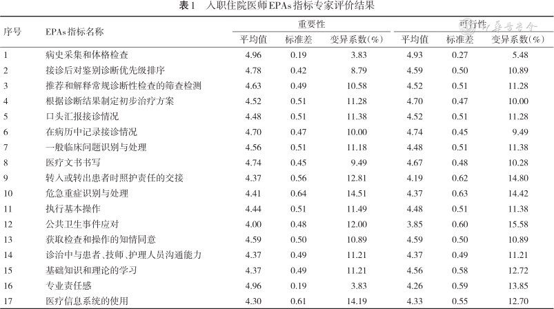 第二轮专家咨询中,除了“公共卫生事件应对”指标以外,其余16项指标的重要性和可行性评分均在4.00分以上,且变异系数小于15.00%,表明专家普遍认同目前的指标设计。同时,专家没有提出对指标体系内容的修改建议,意见趋于一致。形成最终的入职住院医师EPAs指标体系,具体结果见表1。