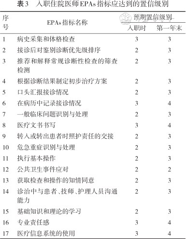 经过两轮德尔菲专家咨询,专家对入职住院医师在不同阶段应达到的EPAs指标置信级别的意见相对集中,各项指标在入职住院医师不同阶段频数最高的置信级别所占总专家数的百分比均超过一半。17个入职住院医师EPAs指标在入职时及第一年末时的预期置信级别见表3。