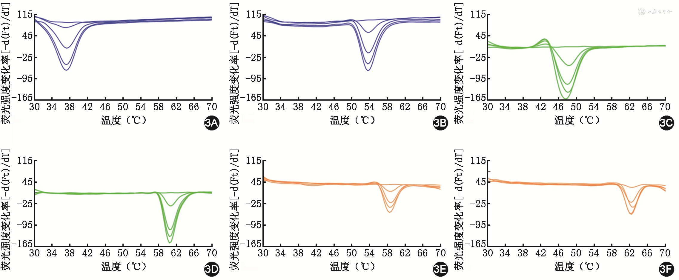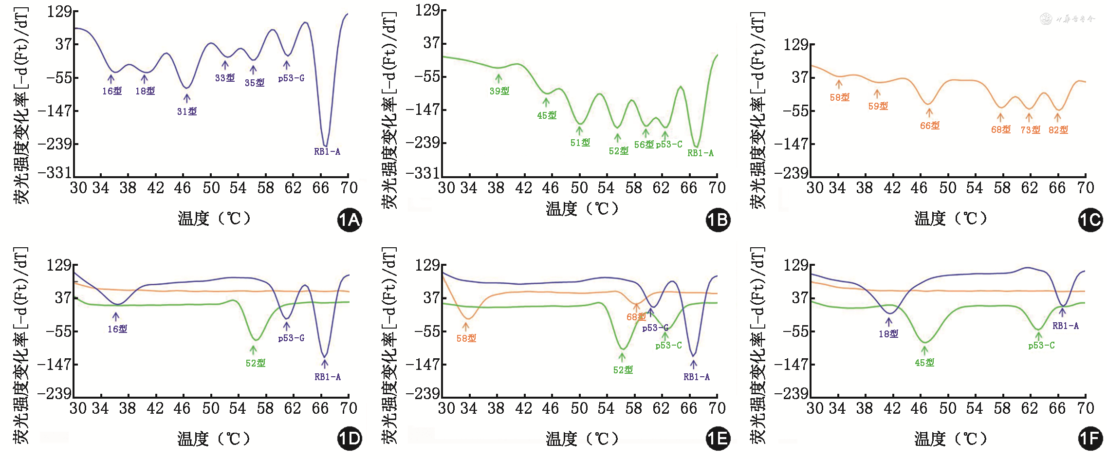 用混合质粒模拟多重感染,2D-PCR检测结果如图1所示,FAM通道在不同温度共有7个熔解谷(图1A),分别对应HPV的16、18、31、33、35型别、p53的G等位基因和RB1的A等位基因;HEX通道共有7个熔解谷(图1B),分别对应HPV的39、45、51、52、56型别、p53的C等位基因和RB1的G等位基因;Alexa Fluor 568通道共有6个熔解谷(图1C),分别对应HPV的58、59、66、68、73和82型别。图1D为应用2D-PCR方法检测同时感染了16、52型HPV的宫颈刷样本的熔解曲线图,该样本p53基因型为G/G;图1E为同时感染了58、68、52型HPV的样本,p53基因型为G/C;图1F为同时感染为18、45型HPV的样本,p53基因型为C/C;3份样本RB1基因型均为A/A型。