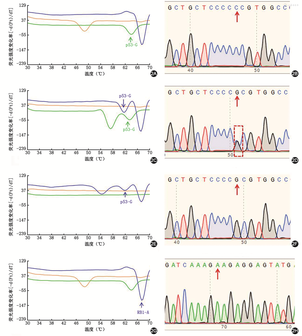 注:a 与探针序列同源的标签序列以小写字母显示,标签上的突变碱基用下划线标出;靶基因特异性引物序列以大写字母显示。p53及RB1带标签引物上的加粗大写字母为人为引入的突变,以提高引物的特异性。b Tm 指的是扩增产物中标签序列的熔解温度。cp53-R由p53-G-F和p53-C-F共用;dRB1-R由RB1-A-F和RB1-G-F共用。F为带标签正向引物,R为反向引物,P为探针
