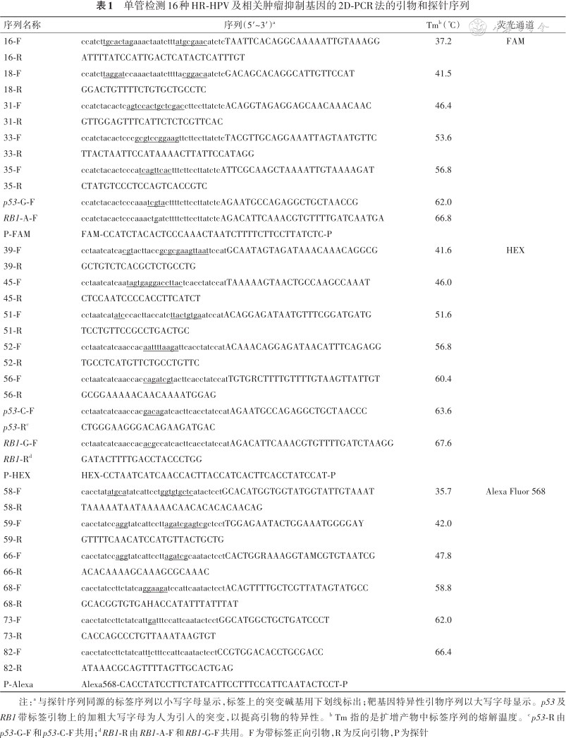 目前,已有直接杂交法、信号放大法、靶向扩增法等方法用于高危型HPV的分型诊断,但都存在灵敏度低、通量小、操作过程复杂等问题[8]。本团队一直致力于闭管高通量 PCR技术的研发。在前期碱基猝灭探针技术[9]的基础上研发了高通量闭管多重二维PCR(two-dimensional PCR,2D-PCR)技术[10]。本研究在前期应用2D-PCR法单管分型9种HR-HPV的基础上进行了优化和创新,建立了一种可以单管同时检测16种高危型HPV和p53、RB1基因突变的方法,不仅极大地增加了检测通量,而且增加了相关肿瘤抑制基因分型的鉴定,为临床更有效、更特异的筛查宫颈病变提供了更加可靠的技术手段。