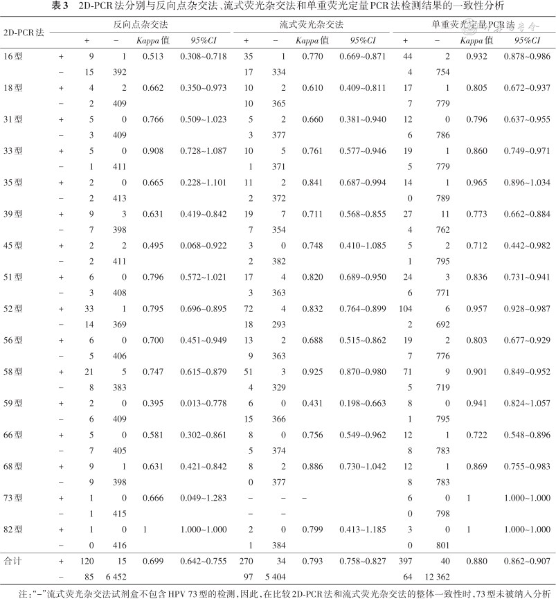 注:“-”流式荧光杂交法试剂盒不包含HPV 73型的检测,因此,在比较2D-PCR法和流式荧光杂交法的整体一致性时,73型未被纳入分析