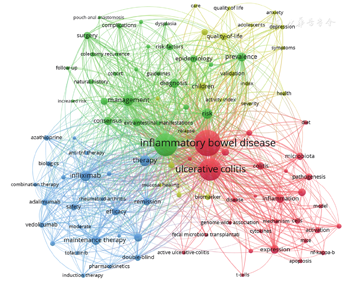 近年来,IBD治疗取得了长足进展,国内外新药研发如火如荼,大量生物制剂和小分子药物不断问世,为IBD患者带来了新选择,目前已经逐渐成为治疗IBD的主流方式[10]。与此对应全球排名较前的关键词中大部分为治疗相关关键词,如英夫利西单克隆抗体、治疗、维持治疗、诱导等。另外,全球越来越多的研究关注IBD患者的生活质量,包括患者疾病负担、焦虑抑郁等,强调重视患者的主观感受,倾听患者的声音[11]。而过去几年我国对于IBD药物治疗以及IBD患者生活质量管理的关注较少,相关研究起步较晚。