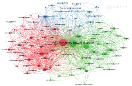 对中国SCI文献关键词共现聚类分析结果如图3所示。共发现IBD研究领域的3个聚类:红色区域聚焦于机制相关基础研究,如表达、炎症、发病机制、激活、细胞、微生物群、癌症、NF-κB信号通路、氧化应激等;绿色区域聚焦于疾病管理与流行病学相关研究,如治疗、管理、风险、患病率、诊断、英夫利西单克隆抗体、流行病学等;蓝色区域聚焦于肠道菌群及相关治疗相关研究,如肠道菌群、粪菌移植、有效、缓解、安全、益生菌、细菌、肠道菌群紊乱等。