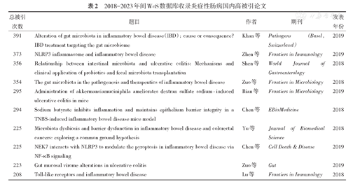 2018-2023年间WoS数据库收录炎症性肠病国内高被引论文