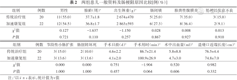 研究期间共收治因肠梗阻行中高位小肠造瘘术的新生儿50例,符合入选标准45例。排除术后因重症感染、败血症、休克家长放弃治疗1例、合并复杂先天性心脏病1例,因远端造瘘口回缩中途退出研究1例,最终纳入42例,其中加速康复组22例、传统治疗组20例。两组患儿性别、胎龄、出生体重、肠梗阻原因、手术日龄、手术用时、术中出血量及造瘘口近端长度比较,差异均无统计学意义(P>0.05)。见表2。
