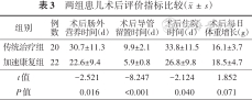 | 组别 | 例数 | 术后肠外 营养时间(d) | 术后导管 留置时间(d) | 术后住院 时间(d) | 术后每日 体重增长(g) |