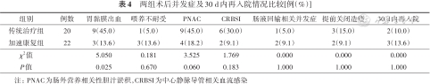 1.并发症:加速康复组胃黏膜出血发生率低于传统治疗组,差异有统计学意义(P<0.05);两组术后喂养不耐受、PNAC、CRBSI发生率比较,差异无统计学意义(P>0.05);两组患儿均未因肠液回输造成肠坏死、肠穿孔等严重并发症,加速康复组1例出现腹泻,1例造瘘口出血,传统治疗组1例出现腹泻,两组差异无统计学意义(P>0.05);两组提前关闭造瘘率比较,差异无统计学意义(P>0.05)。见表4。