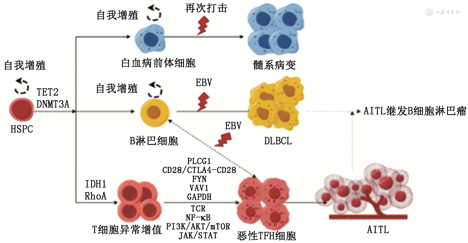 注:DNMT3A为DNA甲基转移酶3A;EBV为EB病毒;AITL为血管免疫母细胞性T细胞淋巴瘤;HSPC为造血干细胞/祖细胞;DLBCL为弥漫大B细胞淋巴瘤