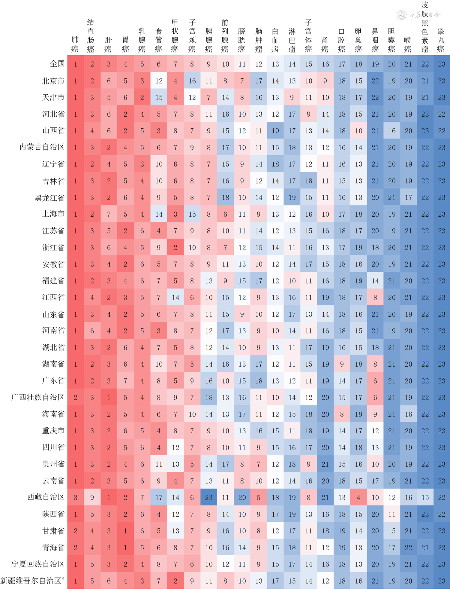 注:仅根据700个肿瘤登记处数据统计;图中数字代表各癌种在对应省(自治区、直辖市)的发病例数顺位;a含新疆生产建设兵团