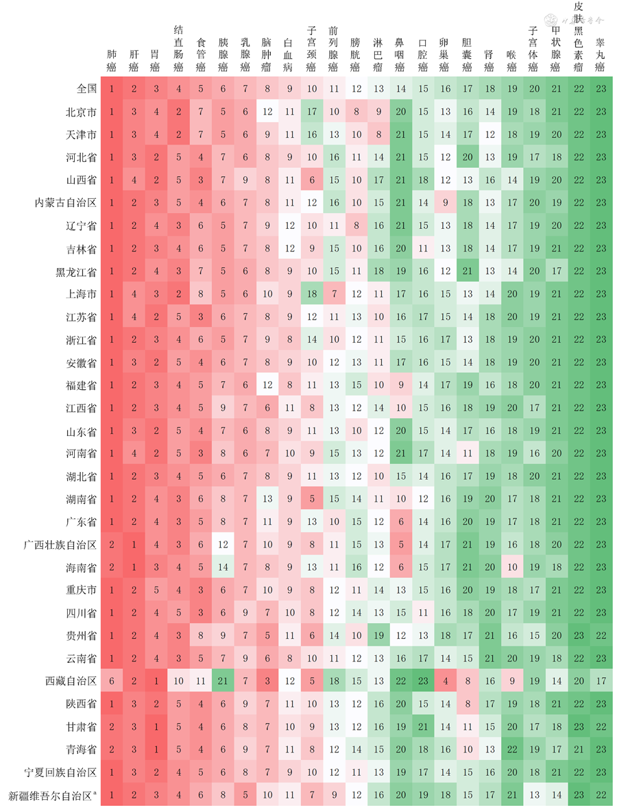 肺癌在全国26个省(自治区、直辖市)中居恶性肿瘤死亡首位,其他5个地区中,广西壮族自治区和海南省恶性肿瘤死亡首位为肝癌,而甘肃省、青海省和西藏自治区首位死因为胃癌。鼻咽癌在广东省、广西壮族自治区和海南省均位居死亡前6位,膀胱癌在北京市和辽宁省死亡顺位相对较高,子宫颈癌在山西省、湖南省、贵州省和西藏自治区死亡顺位相对较高,而食管癌在上海市和西藏自治区死亡顺位相对靠后。除西藏自治区外,肺癌、肝癌、胃癌、结直肠癌和食管癌在各省(自治区、直辖市)均位居恶性肿瘤死亡前10位(图2)。