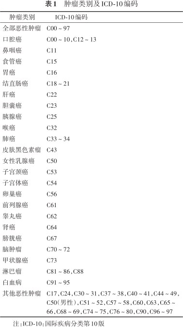 3. 肿瘤类别定义:本研究报告23类主要恶性肿瘤的发病和死亡情况,根据国际疾病分类第10版编码,其中,部位不明和未特指部位的恶性肿瘤等比例拆分到对应肿瘤类别下,包括C14拆分到C00~13,C26拆分到C15~25,C39拆分到C32~34,C55拆分到C53~54(表1)。