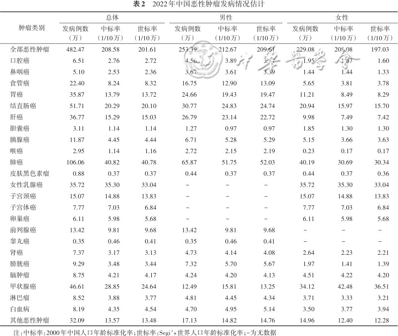 郑荣寿, 陈茹, 韩冰峰, 等. 2022年中国恶性肿瘤流行情况分析[J]. 中华肿瘤杂志, 2024, 46(3): 221-231. DOI: 10.3760/cma.j.cn112152-20240119-00035.