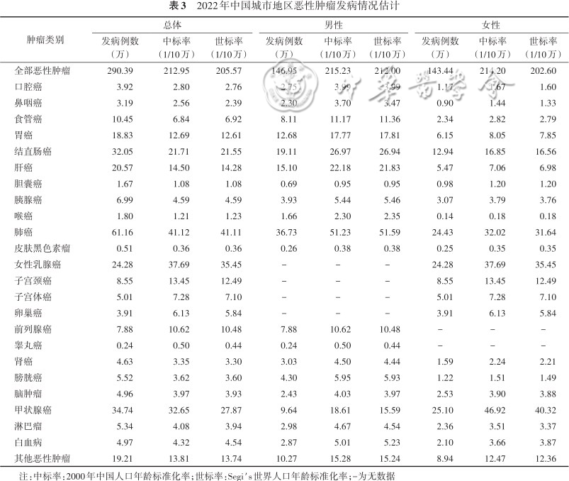 2. 城市地区发病情况:2022年中国城市地区新发恶性肿瘤估计为290.39万例,其中男性146.95万例,女性143.44万例;中标发病率为212.95/10万,男性为215.23/10万,女性为214.20/10万。肺癌居城市地区恶性肿瘤发病首位(61.16万),占城市地区全部恶性肿瘤的21.1%,其后依次为甲状腺癌(34.74万)、结直肠癌(32.05万)、女性乳腺癌(24.28万)和肝癌(20.57万),发病前5位的恶性肿瘤占城市地区全部恶性肿瘤的59.5%。城市地区男性高发恶性肿瘤为肺癌(36.73万)、结直肠癌(19.11万)和肝癌(15.10万)等,女性为甲状腺癌(25.10万)、肺癌(24.43万)和乳腺癌(24.28万)等(表3)。