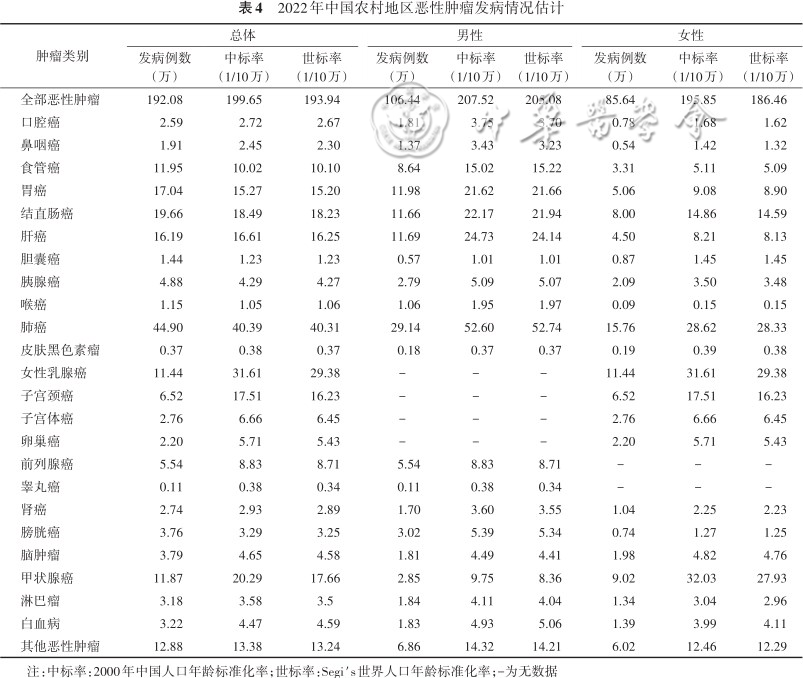2022年中国恶性肿瘤新发病例估计为482.47万(男性253.39万,女性229.08万),中标发病率为208.58/10万(男性212.67/10万,女性208.08/10万)。城市地区恶性肿瘤新发病例约290.39万,中标发病率为212.95/10万;农村地区192.08万,中标发病率为199.65/10万。发病例数前5位的恶性肿瘤(肺癌106.06万,结直肠癌51.71万,甲状腺癌46.61万,肝癌36.77万,女性乳腺癌35.72万)占全部新发病例的57.4%。2022年中国恶性肿瘤死亡病例估计为257.42万(男性162.93万,女性94.49万),中标死亡率为97.08/10万(男性127.70/10万,女性68.67/10万)。城市地区恶性肿瘤死亡病例约140.06万,中标死亡率为92.37/10万;农村地区117.34万,中标死亡率为103.97/10万。死亡例数前5位的恶性肿瘤(肺癌73.33万,肝癌31.65万,胃癌26.04万,结直肠癌24.00万,食管癌18.75万)占全部死亡病例的67.5%。肺癌居男、女恶性肿瘤发病和死亡首位,城市地区恶性肿瘤发病率高于农村地区,死亡率低于农村地区。
