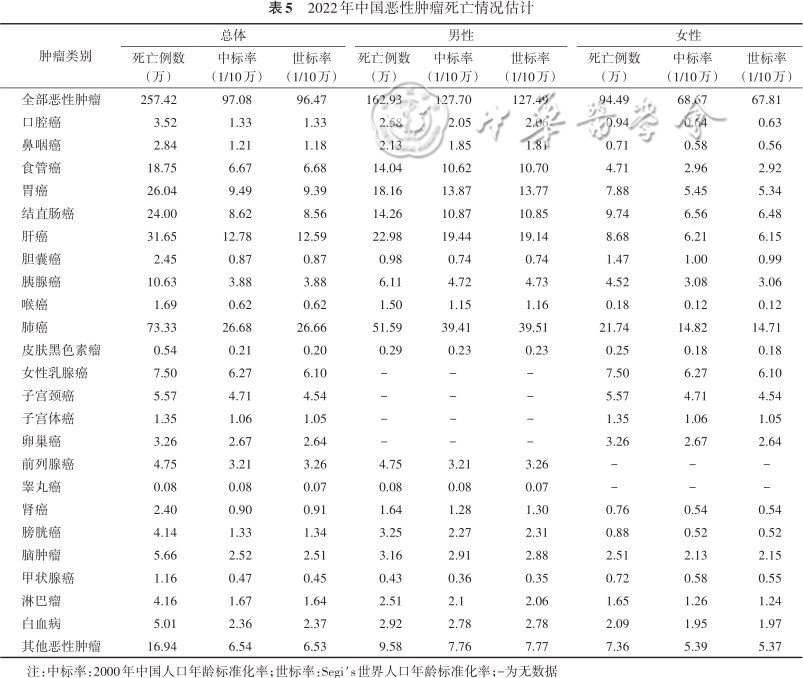 4. 总体死亡情况:2022年全国恶性肿瘤死亡病例估计为257.42万例,其中男性162.93万例,女性94.49万例;恶性肿瘤总体中标死亡率为97.08/10万,男性为127.70/10万,女性为68.67/10万。肺癌居恶性肿瘤死亡首位,2022年因肺癌死亡病例约73.33万,占全部恶性肿瘤死亡的28.5%,其后依次为肝癌(31.65万,12.3%)、胃癌(26.04万,10.1%)、结直肠癌(24.00万,9.3%)和食管癌(18.75万,7.3%),死亡前5位的恶性肿瘤占全部恶性肿瘤的67.5%(表5)。