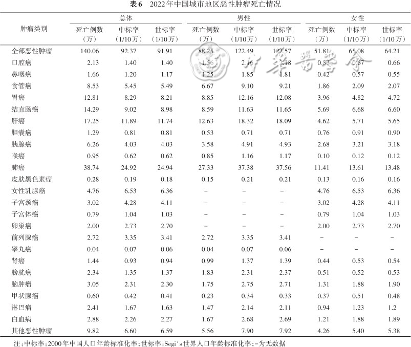 5. 城市地区死亡情况:2022年中国城市地区恶性肿瘤死亡病例估计为140.06万例,其中男性88.25万例,女性51.81万例;中标死亡率为92.37/10万,男性为122.49/10万,女性为65.08/10万。城市地区死亡前5位的恶性肿瘤依次为肺癌(38.74万)、肝癌(17.25万)、结直肠癌(14.29万)、胃癌(12.81万)和食管癌(8.53万),占城市地区全部恶性肿瘤死亡的65.4%。城市地区男、女恶性肿瘤死亡首位均为肺癌,不同性别前5位恶性肿瘤死亡占全部恶性肿瘤的比例分别为男性72.6%,女性58.8%(表6)。