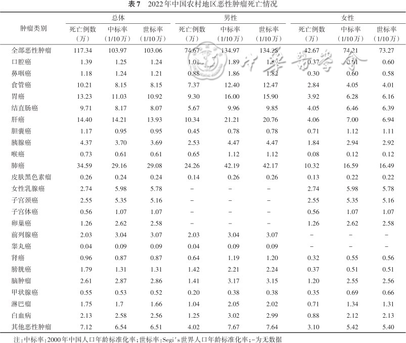 6. 农村地区死亡情况:2022年中国农村地区恶性肿瘤死亡病例估计为117.34万例,其中男性74.67万例,女性42.67万例;中标死亡率为103.97/10万,男性为134.97/10万,女性为74.21/10万。农村地区死亡前5位的恶性肿瘤依次为肺癌(34.59万)、肝癌(14.40万)、胃癌(13.23万)、食管癌(10.21万)和结直肠癌(9.71万),占农村地区全部恶性肿瘤死亡的70.0%。农村地区男、女恶性肿瘤死亡首位均为肺癌,不同性别前5位恶性肿瘤死亡占全部恶性肿瘤的比例分别为男性76.3%,女性59.0%(表7)。