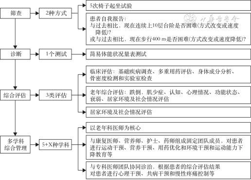 基于综合评估结果,除运动干预、营养干预、共病和用药管理与环境干预外,对患者进行心理干预、慢性疼痛控制等也是非常重要的。个体化的综合干预能够更全面地去除或减少运动能力下降的病因,治疗或预防运动能力下降的并发症,降低致残率和病死率,提高老年人的生活质量。因此,教育、营养、多重用药、共病治疗等多学科团队的建立对运动能力下降的综合管理是非常必要的。除此之外,近年研究发现针灸治疗对急性缺血性脑卒中伴早期运动功能障碍患者临床效果良好,能有效改善肢体功能、恢复神经功能缺损程度[88]。睾酮、抗氧化剂、抗炎药等对运动能力下降的治疗也正在研究中[89, 90, 91]。