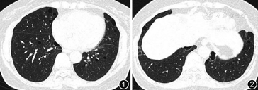 患者,60岁女性,因“间断气短1个月”至北京协和医院呼吸与危重症医学科门诊就诊。近1 个月来出现间断气短,无明显咳嗽、咯痰,无发热;近5年曾出现3次自发性气胸,既往无高血压、糖尿病等慢性病史。兄弟姐妹共4人,哥哥有气胸史。患者门诊胸部CT见双肺多发、大小不一的薄壁囊状透亮影(图1, 2),形状不规则(可见圆形、椭圆形和扁平状),部分融合,主要分布于中下肺及双肺基底部,邻近纵隔胸膜下。考虑伯特-霍格-杜布(Birt-Hogg-Dubé syndrome,BHD)综合征诊断可能性大,行外周血全外显子测序后确诊BHD综合征:染色体17p11.2区域存在约2 kb的拷贝数杂合缺失变异:主要累及FLCN 基因45号外显子及其相邻内含子。泌尿系超声:左肾小囊肿。BHD综合征是一种罕见常染色体显性遗传性疾病,特征为弥漫性肺部囊状病变、自发性气胸、皮肤纤维毛囊瘤或毛盘瘤和肾脏肿瘤;针对肺部囊性病变目前尚无有效的治疗药物,日常需要避免长途飞行、屏气负重等以减少自发性气胸的发生。本例患者有反复自发性气胸、双肺多发近胸膜分布为著的大小和形态不均一的囊泡影,结合基因检测后确诊BHD综合征。