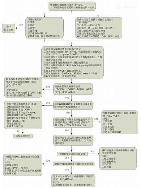 通过仔细询问病史、查体,以及相关实验室检查,明确导致嗜酸性粒细胞增多症的可能原因,并评价可能的嗜酸性粒细胞相关终末器官受损或功能异常(图1)。
