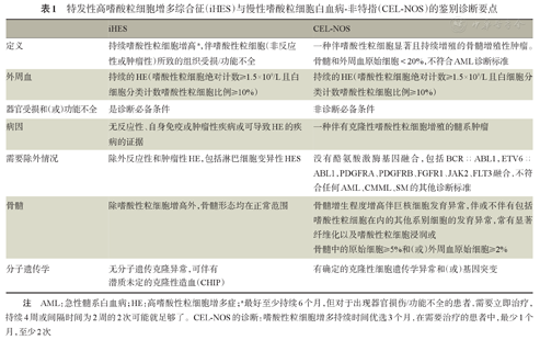 注 AML:急性髓系白血病;HE:高嗜酸性粒细胞增多症;a最好至少持续6个月,但对于出现器官损伤/功能不全的患者,需要立即治疗,持续4周或间隔时间为2周的2次可能就足够了。CEL-NOS的诊断:嗜酸性粒细胞增多持续时间优选3个月,在需要治疗的患者中,最少1个月,至少2次