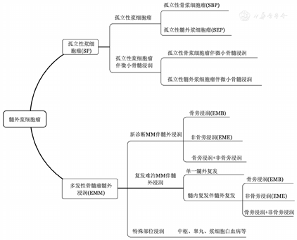 EMP可根据是否达到多发性骨髓瘤(MM)的诊断标准,分为孤立性浆细胞瘤(solitary plasmacytoma,SP)和多发性骨髓瘤髓外浸润(extramedullary multiple myeloma,EMM)。前者可根据受累部位、是否伴随骨髓侵犯进一步分类;后者可根据受累部位、髓外病灶出现的时机等进行分类。具体分类见图1。