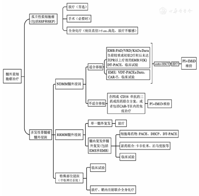 EMM患者的治疗方案需根据患者的年龄、体能状况和髓外病变情况制定,治疗推荐如下(图2):