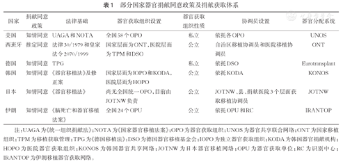 部分国家器官捐献同意政策及捐献获取体系