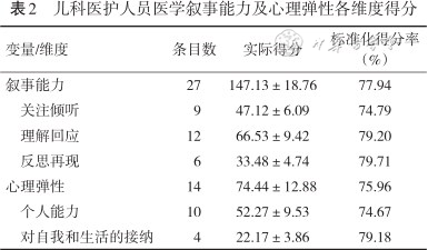 儿科医护人员医学叙事能力及心理弹性各维度得分