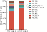 新生儿早发感染组孕妇阴道菌群中叶杆菌属、双歧杆菌属相对丰度低于非早发感染组,差异有统计学意义(P<0.05)。早发感染组孕妇阴道菌群中大肠埃希-志贺菌属和链球菌属占比分别为6.0%和7.2%,非早发感染组分别为2.4%和2.1%,但两组比较差异无统计学意义(P>0.05),见图2。肠球菌属在早发感染组占比为0.17%,非早发感染组为0.07%,两组比较差异有统计学意义(P<0.05)。