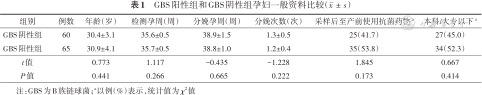 | GBS阴性组 | 60 | 30.4±3.1 | 35.6±0.5 | 38.9±1.5 | 1.3±0.5 | 25(41.7) | 27(45.0) |