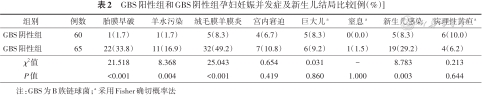 两组孕妇均未发生早产。GBS阳性组胎膜早破、羊水污染、绒毛膜羊膜炎、新生儿感染发生率均高于GBS阴性组,差异有统计学意义(P<0.05);两组巨大儿、窒息、宫内窘迫、新生儿病理性黄疸比例比较差异无统计学意义(P>0.05),见表2。