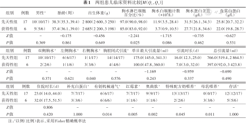 共纳入23例患儿,先天性组17例(73.9%),获得性组6例(26.1%)。两组患儿性别、胎龄、出生体重比较差异无统计学意义(P>0.05)。与获得性组相比,先天性组淋巴细胞百分比(97.0%比85.0%)、使用红霉素(7/17比1/6)及奥曲肽(9/17比1/6)、特殊配方奶喂养(13/17比2/6)比例更高,右侧胸水发生率(1/17比3/6)、有创机械通气比例(6/17比6/6)、母乳喂养率(0/17比3/6)更低,差异均有统计学意义(P<0.05)。两组胸水白细胞计数、胸水及血浆蛋白含量、双侧及左侧胸水发生率、胸腔闭式引流比例、单日最大引流量、引流时长、总引流量、白蛋白使用率、住院时长、存活率方面比较差异无统计学意义(P>0.05)。18例经保守治疗胸腔积液吸收无复发;5例患儿住院期间死亡,其中4例因家长放弃治疗后死亡,1例胸导管结扎术后并发新生儿坏死性小肠结肠炎死亡。