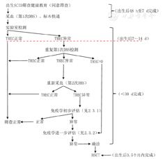 共识5:原DBS标本2次检测TREC含量低于切值(根据各实验室具体参考标准)判为初筛阳性[18],建议尽快召回复查。高度可疑的患儿建议立即召回以明确诊断,并做必要的保护性隔离措施。依据国内外新生儿疾病筛查经验,自出生进行NBS到确诊实验完成并开始干预,周期建议在<30 d[19,20](证据等级:Ⅱ b;推荐强度:B)。