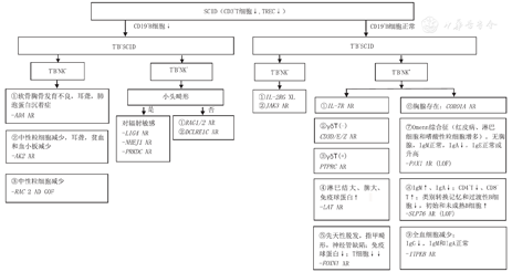 | (9)LAT缺陷(LAT) | 16q13 | AR | ↓或正常 | ↓或正常 | ↓ | 典型SCID或CID,CID表现为反复感染、肝脾淋巴结大、自身免疫性疾病 |