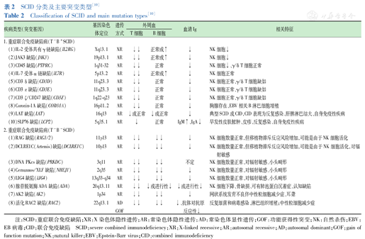 共识1:2022年国际免疫学会联合会(International Union of Immunology Societies,IUIS)原发性免疫缺陷病分类委员会的SCID最新分类、突变基因类型、遗传方式、免疫表型和临床特征见表2[10](证据等级:专家共识)。