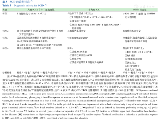 | 标准3 | 无法用其他原因解释的T细胞数量减少/和/或TREC检测不到或非常低/或<20%的CD4+T细胞为CD45RA+初始细胞 | T细胞增殖功能降低d | 全身皮疹(红皮病表现)且无经胎盘传递而来的母体T细胞 |