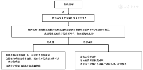 简短戒烟干预是指医护人员在临床诊疗过程中,为吸烟者提供快捷有效的戒烟建议和帮助。简短戒烟干预一般耗时不超过3 min。具体流程见图1。