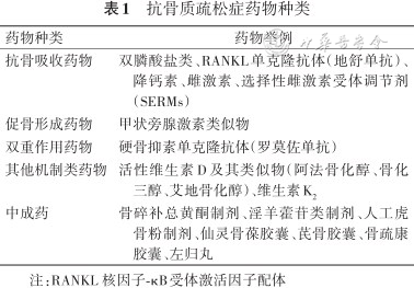 对于已确诊骨质疏松症的患者以及虽处于骨量减少,但FRAX®预计未来10年髋部骨折风险≥3%或任何主要骨质疏松性骨折发生风险≥20%的患者,在补充钙剂和维生素D的同时,需要积极给予规范抗骨质疏松药物治疗[4]。目前抗骨质疏松药物种类主要包括抗骨吸收药物、促骨形成药物、双重作用药物、其他机制药物及中成药等,见表1。
